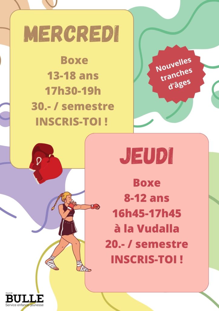 Si tu hésites, viens tester une fois sans inscription ni engagement. Chaque semestre coûte CHF 20.- (excepté la boxe 13-18 ans qui coûte 30CHF). Cette somme est à régler au plus tard lors du deuxième cours. Cliquez sur une des images pour vous inscrire !Programme
