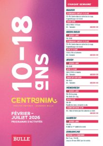 Du mercredi au samedi, les jeunes Bullois-es âgé-e-s de 10 à 18 ans ont la possibilité de venir librement au Centranim pour passer un moment convivial. Ainsi les jeunes disposent d’un lieu de rencontres en dehors du cadre scolaire. Des animateurs-trices accompagnent ces moments et proposent des activités en fonction de l’envie des personnes présentes. Dans le cadre des horaires indiqués dans le programme, les jeunes peuvent venir et repartir librement.